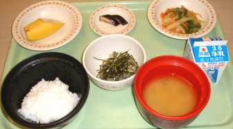 | | ごはん120g | 里芋のみそ汁 | こんにゃくののり和え | 野菜の拍子切り炒め | 茄子のぬか漬け | バナナ | 牛乳