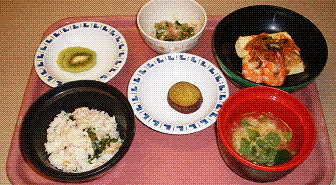 | | わかめご飯120g | 豆腐の千草あんかけ(蒸しエビ添え| お浸し 梅風味 | ふかし芋 | キウイフルーツ | かき卵汁 | |